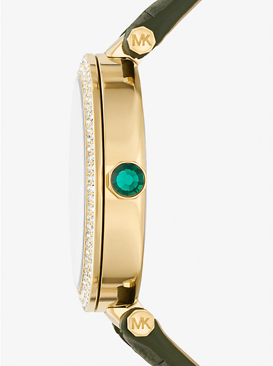 Turn your attention to the Parker: this sleek-and-chic timepiece is trimmed with sparkling pavé stones for an elegant, uptown sensibility. We updated this favorite by adding our gold-tone Signature logo onto the pearlescent green dial, then finished it with a crocodile-embossed leather strap for an extra dose of edge. With just the right amount of sparkle, it’s the perfect watch to glam up an everyday look.